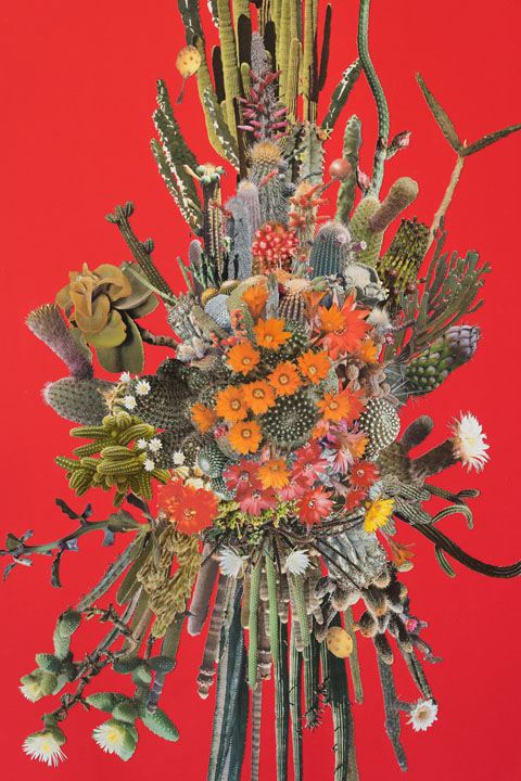 Stephen Eichhorn’s intricate flora collages pay homage to the Ages of the Anthropocene and Psychedelia, creating a transportive experience through the act of looking. Succulents, Cacti and other plant matter are arranged and intuitively piled, creating hybrid plants in micro-ecosystems that take on strangely familiar, yet cosmic forms. Using design elements and materials sourced from historical botany textbooks and other publications, these works on paper and panel heighten our connection to the natural and man-made climates that surround us.